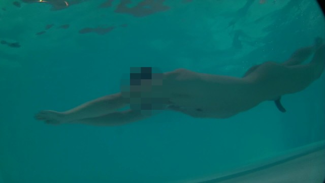 Twink loses trunks in hotel pool and swims naked