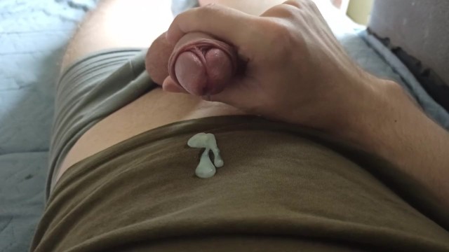 The guy cums on his T-shirt with his sweet cum