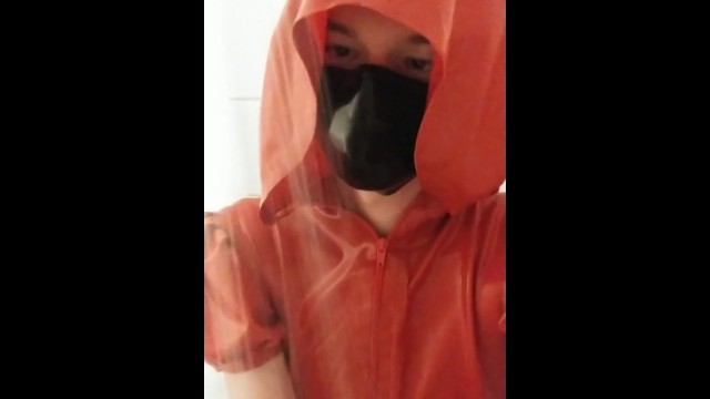 Shower undressing red latex hooded swing dress and stockings and transparent pants wetsuiterest