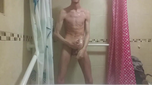 Hot very skinny guy with flat butt strokes his wet cock and pisses
