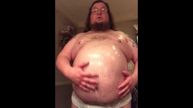 380 lb gainer oiling up belly, talking about night shakes and recent gains