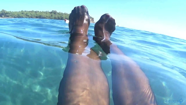 stocking and red toes in the sea