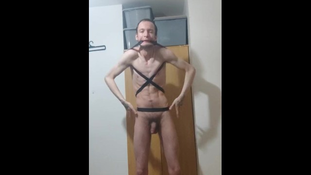 Very skinny teen using elastic band to pleasure himself while his mouth is gagged solo bondage