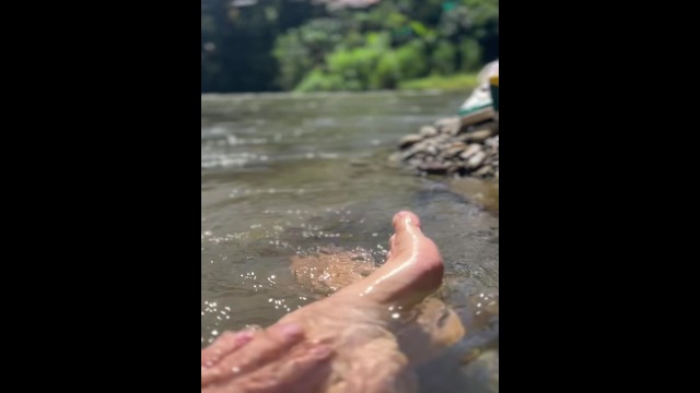 Refreshing summer day. Femboy semi naked in the middle of the lake, alone and hot