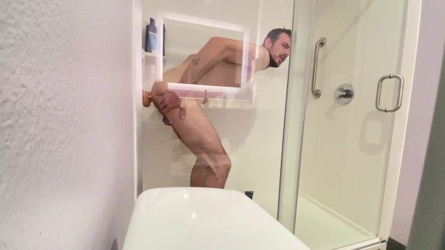 Straight guys first time riding his big white dildo in hotel shower