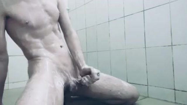 A young guy with a big dick shaves and masturbates in a public shower