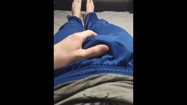 A guy in blue sweatpants rubs his bulge