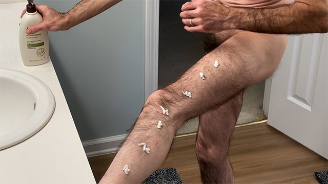 Putting lotion on my dry skin and I couldn't resist playing with my hairy little dick