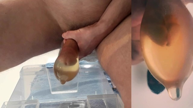 beautiful hard cock pisses in condom and fucks his pee into big cumshot with floating sperm