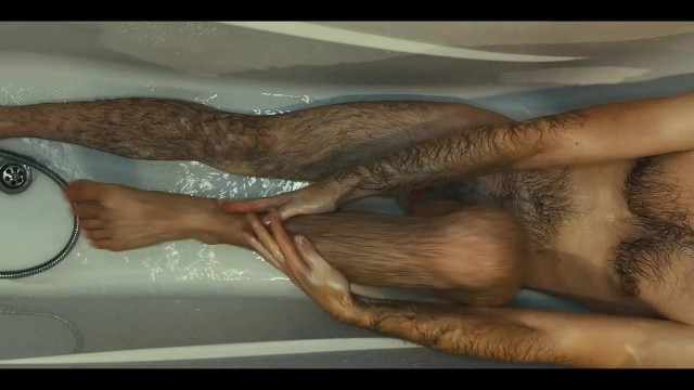Hairy guy soaps up in bath, strokes, plays with his dick and foreskin and pisses on himself
