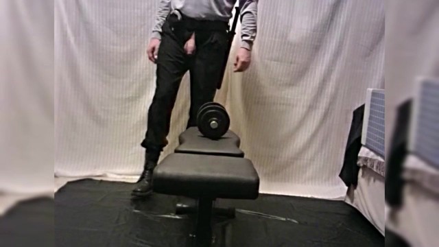 remo a una mano, de uniforme vigilante de seguridad, mostrando polla
