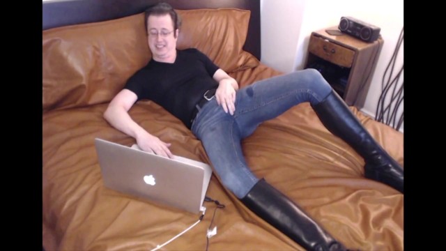 I cum in my jeans and tall boots watching porn on my leather bed