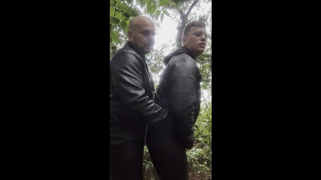 Having horny fun at the forest with leather clouths on, huge creampie, and cum in mouth.
