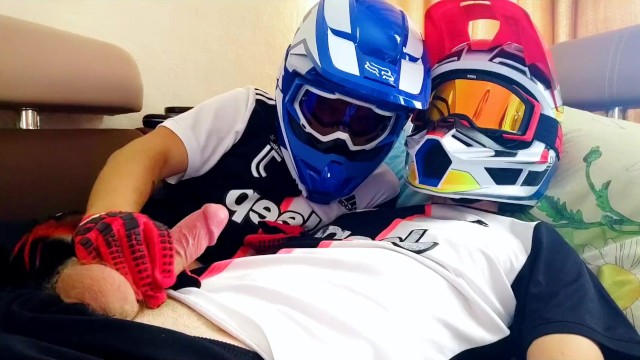 Two guys in helmets jerk off and cum
