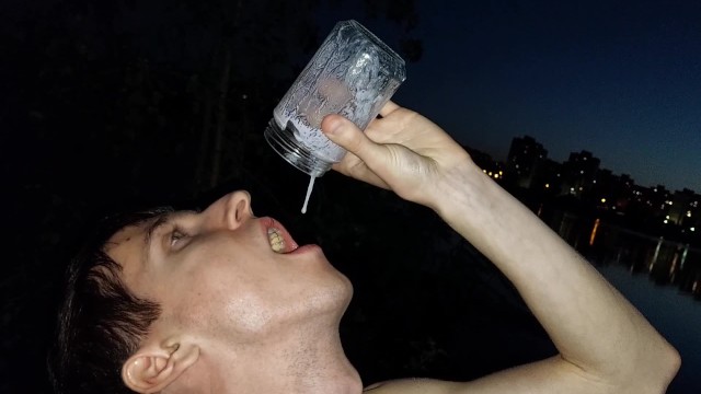 Daddy's son jerks off his meat on the riverbank and eats his sperm right after he cums in a glass