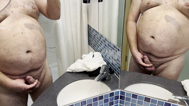 Hotel Bathroom Mirror – Chubby Hairy Bear Jerks His 11cm Cock & Cums in Sink