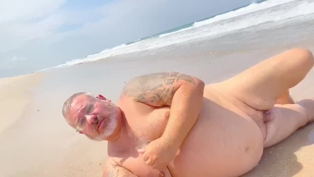 Old fat grey haired man has naked day and cums big at the beach