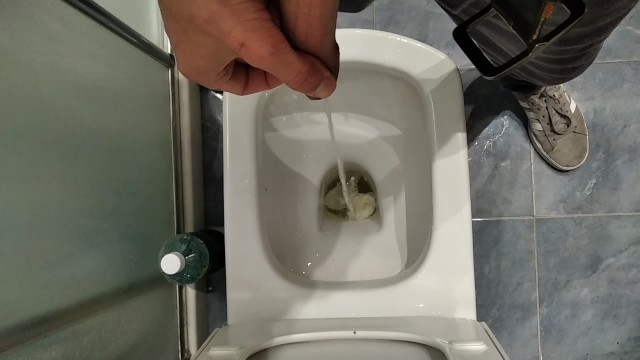 Big Cock Pisses in the Bathroom and then Jerks Off with Massage Body Oil
