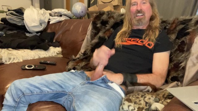 Longhairdude gooning and shooting in jeans and a tshirt on the couch - widescreen
