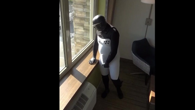 cumming inside wetsuit watching construction workers outside hotel