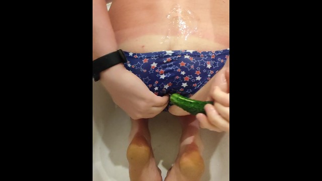 Stretching my anus with a cucumber in my new panties. Lots of lube