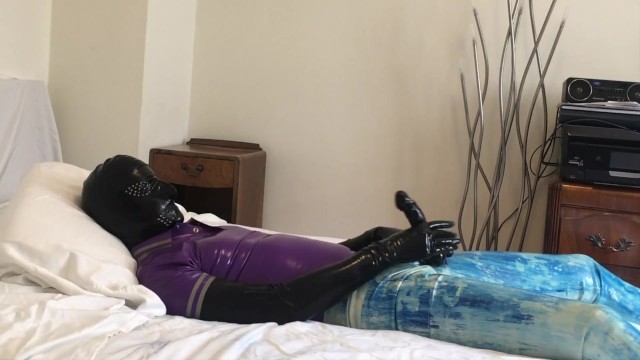 Rubber clothes strip to rubber skin and LOUD cum in sheath