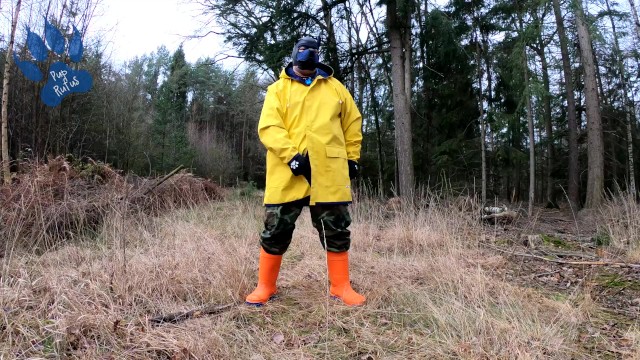 Raingear pup wanking outdoors during sunday walkies (nearly got caught)